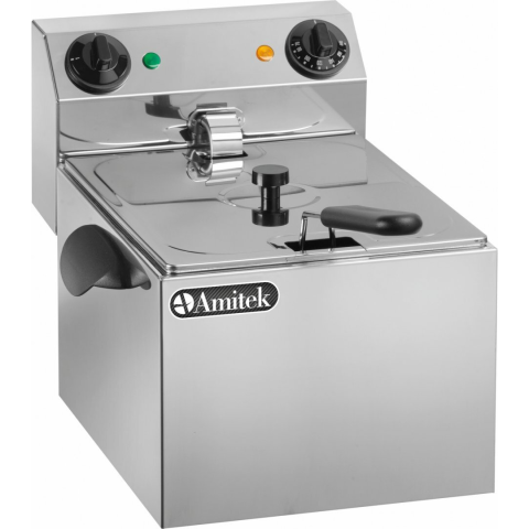 6 literes medence, lekerekített medence sarkok, kiemelhető fejegység, tisztítható fűtő elemek, főkapcsoló, üzemi visszajelző lámpa, hőfokszabályzó, 1 db műanyag nyelű rozsdamentes fritőzkosár, kosár akasztó, olajszűrő, állítható lábakon. Kapacitás: 12 kg/óra (burgonya) Teljesítmény: 3,25 kW/230V-1N~ Mérete: 280x430x210 mm