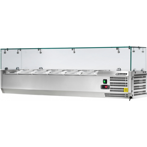Inox burkolat, nagy sűrűségű hőszigetelés, statikus hűtés, jobb oldalra szerelt kompresszor, kisfeszültségű vezérlő panel, automata leolvasztás és kondenzvíz párologtatás, edényzet nélkül. Kapacitás: 6xGN1/4-es 150mm mély edényhely - edényzet nélkül Hűtés: +2/+8°C (max. +33°C/60% páratartalomig) Teljesítmény: 0,34 kW/230V-1N~ Mérete: 1400x330x400 mm