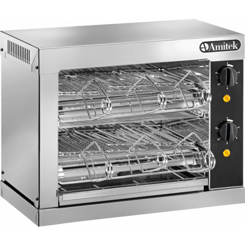 2 szintes, 3+3 csipeszes, rozsdamentes acél kialakítás kívül-belül, kvarclámpás melegítés, teljesítményszabályzó, 1-15 perces időzítő. Hasznos belmagasság: 80 mm Teljesítmény: 3 kW/230V-1N~ Mérete: 440x240x380 mm