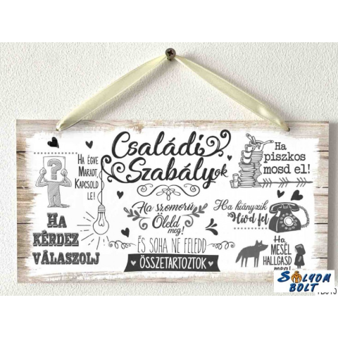 Fali dekoráció, tökéletes ajándék, felirattal. Befogó mérete: 12 x 19 cm Anyaga : 2,5 mm kemény papír Felakasztható Családi szabályok: Ha égve maradt, kapcsold le Ha kérdez, válaszolj Ha szomorú, öleld meg Ha piszkos, mosd el Ha hiányzik, hívd fel Ha