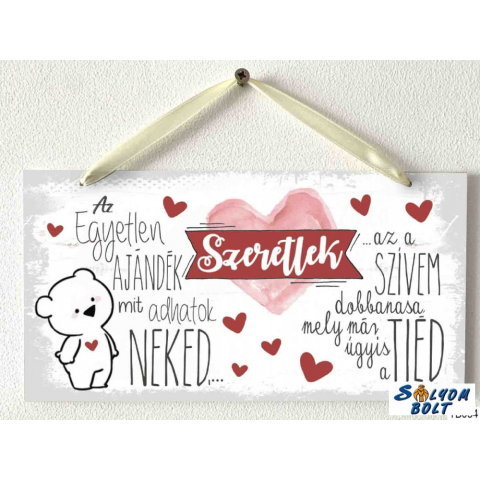 Fali dekoráció, tökéletes ajándék, felirattal. Befogó mérete: 12 x 19 cm Anyaga : 2,5 mm kemény papír Felakasztható Az egyetlen ajándék, mit adhatok neked, az a szívem dobbanása, mely már úgyis a tiéd. Szeretlek!