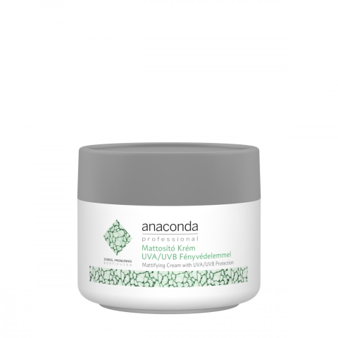 Anaconda Mattosító krém UVA-UVB fényvédelemmel 50ml ANA-8006846 Zsíros, problémás bőr termékcsalád Hidratáló krém, amely hatóanyagainak köszönhetően szabályozza a fokozott faggyúműködést, ezáltal megszünteti