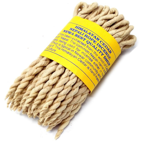 A Növényi Kötél Füstölők kézi gyártással készülnek egyedi himalájai növényekből. A fehér és piros cédrusfa, a narddal, fahéjjal, salduppal és szegfűszeggel együtt szárítás után finom porrá van törve és rizspapírba csomagolva kötéllé van sodorva. A füstölő