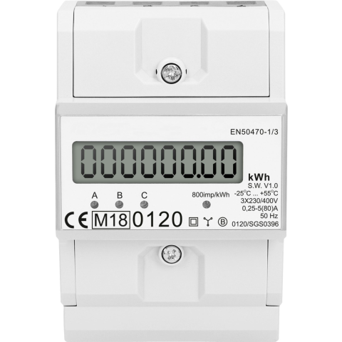 321516 - fogyasztásmérő LCD kijelzővel, 4,3 modul, DIN sínre szerelhető - tápfeszültség: 3x230V/400V AC, frekvencia: 50Hz - impulzuskimenettel rendelkezik . 800 impulzus/1Kwh - méréshatár : 0,25-80A, direkt bekötéssel - referencia áram: 5A - kijelző: Dig