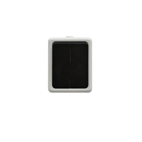 321122 - falon kívüli - 10 A; 250 V; 60Hz - IP54: kültér; por ellen védett (nem károsító mértékű behatolás megengedett); fröccsenő víz ellen védett minden irányból - két billentyűből álló kapcsoló, két különálló helyiség egy helyről történő fel-és lekapcs