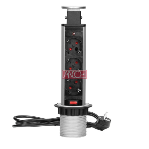 321295 - 3 földelt aljzat kapcsolóval - 230V AC / 56-60Hz; maximális terhelés: 3680W - 1,8m hosszabbítóval és dugóval: H05VV-F 3x1,5mm2 - méretek: Ø 84 x 284 mm - beépítési méret: Ø 60 x 284 mm - IP20: beltéri használatra - ezüst színben