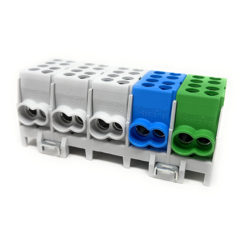 2080516 - 5 pólus csavaros csatlakozású - 3 db szürke, 1 db kék, 1 db zöld - bemeneti keresztmetszet: 10 x 25 mm2 - kimeneti keresztmetszet: 10 x 16 mm2 - Cu/Al, 130/100A - TS35 sínre pattintható - csomagolási egység: 1 db