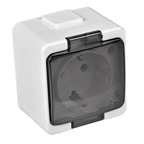 321343 - falon kívüli - átlátszó csapófedéllel - 16 A; 250 V; 60Hz - IP44: kültéri; apró méretű szilárd tárgyak ellen védett (>1 mm); fröccsenő víz ellen védett minden irányból - csavaros bekötésű - méretek: 62x 65 x 44 mm - fehér