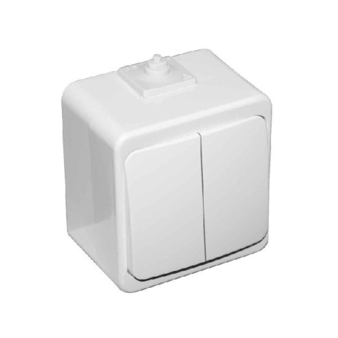 321347 - falon kívüli - 10 A; 250 V; 60Hz - IP44: kültéri; apró méretű szilárd tárgyak ellen védett (>1 mm); fröccsenő víz ellen védett minden irányból - két billentyűből álló kapcsoló. Egy fogyasztói csoport megosztott kapcsolására, illetve két különálló