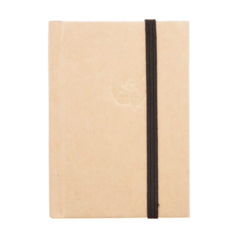 Újrahasznosítható anyagból készült karton borítású, 60 lapos jegyzetfüzet, csíkos lapokkal, gumipánttal zárható.