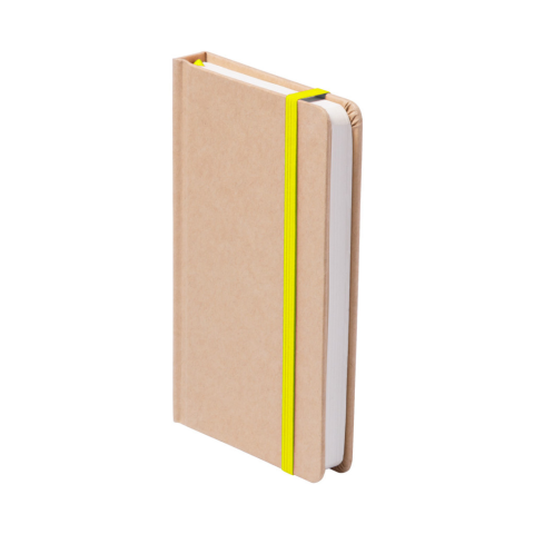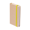 Újrahasznosított karton borítású jegyzetfüzet 100 sima lappal, megegyező színű könyvjelzővel és gumipánttal.