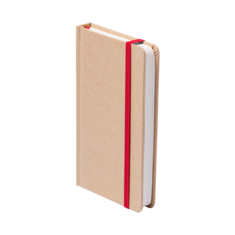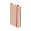 Újrahasznosított karton borítású jegyzetfüzet 100 sima lappal, megegyező színű könyvjelzővel és gumipánttal.