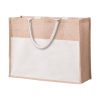 Laminált juta anyagú strandtáska, pamut hordfülekkel és elülső zsebbel.