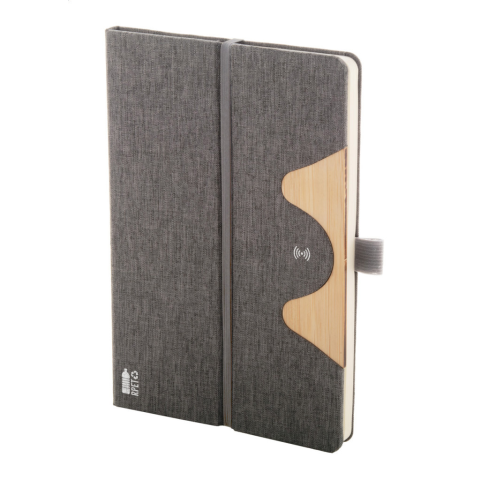 RPET poliészter borítású jegyzetfüzet bambusz betéttel, mobiltartó funkcióval és beépített vezeték nélküli gyorstöltővel (15W). 80 vonalas lappal, újrahasznosított papírból. A5 méretű. USB töltőkábellel szállítjuk.