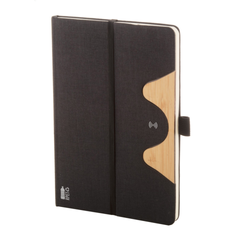 RPET poliészter borítású jegyzetfüzet bambusz betéttel, mobiltartó funkcióval és beépített vezeték nélküli gyorstöltővel (15W). 80 vonalas lappal, újrahasznosított papírból. A5 méretű. USB töltőkábellel szállítjuk. Eleje - bal oldalSzitanyomás 50mm x