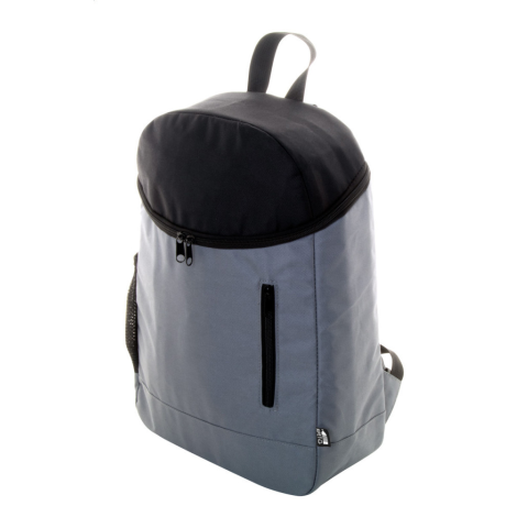 RPET hűtőtáska hátizsák alumínium béléssel, hálós oldalzsebekkel, cipzáras rekesszel és oldalzsebekkel. 600D RPET poliészter, megkülönböztető RPET címkével.