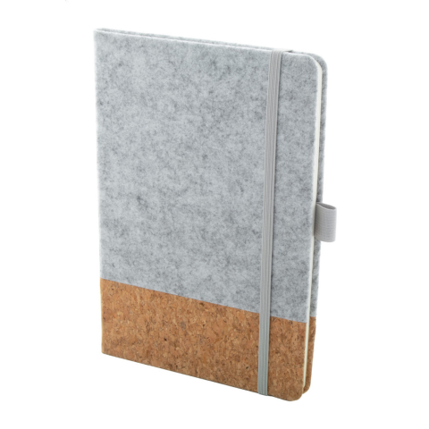 RPET filc és természetes parafa borítású jegyzetfüzet újrahasznosított papírból készült 80 vonalas lappal, gumipánttal, könyvjelzővel és tolltartóval. A5 méretű.
