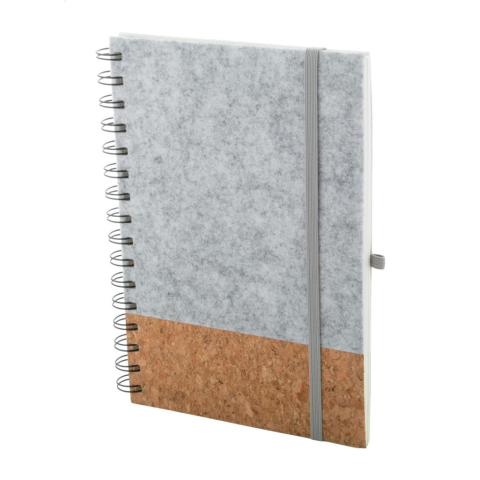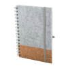 RPET filc és természetes parafa borítású jegyzetfüzet újrahasznosított papírból készült 70 vonalas lappal, gumipánttal és tolltartóval. A5 méretű.