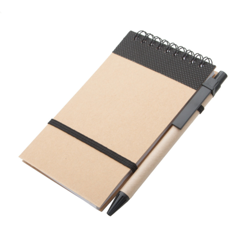 Újrahasznosított papírból készült spirál jegyzetfüzet 70 vonalas lappal, újrahasznosított karton golyóstollal. Kék tollbetéttel szállítjuk. A6 méretű.