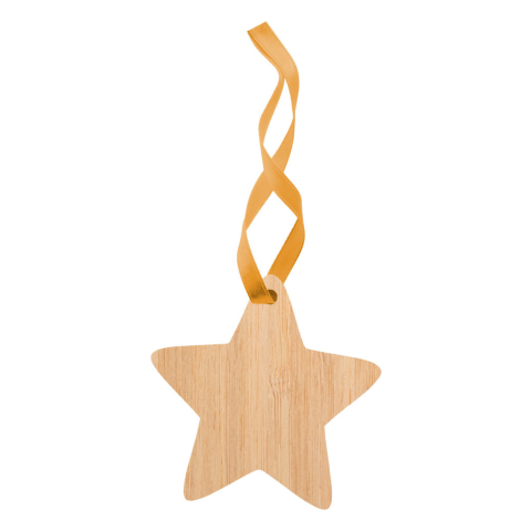 Bambusz furnérból készült karácsonyfadísz arany szalaggal. A szalagot a dísz mellé csomagolva szállítjuk.