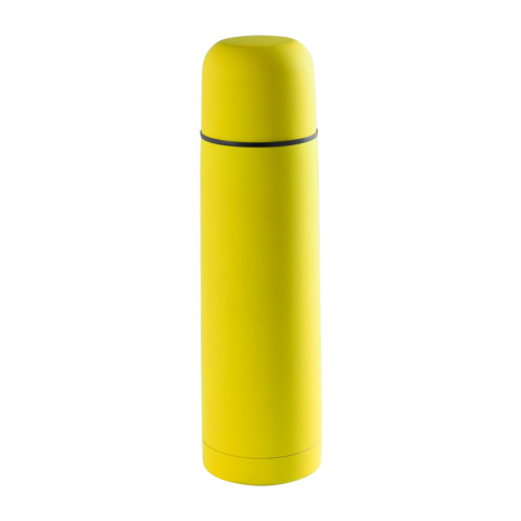 Rozsdamentes acélból készült termosz, gumiborítással, 500 ml. Kartondobozban szállítjuk.