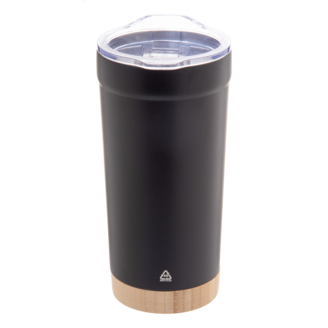 Duplafalú, újrahasznosított rozsdamentes acél vákuumszigetelt thermo pohár bambusz alappal és ABS műanyag ivófedéllel. 600 ml.