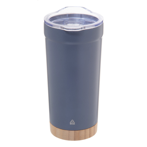 Duplafalú, újrahasznosított rozsdamentes acél vákuumszigetelt thermo pohár bambusz alappal és ABS műanyag ivófedéllel. 600 ml.