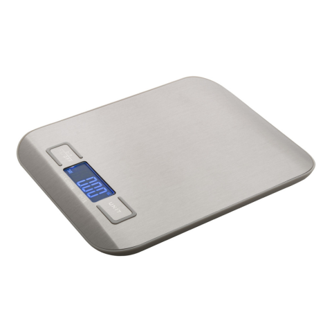 Rozsdamentes acél digitális konyhai mérleg háttérvilágítással. Méréshatár 5 kg-ig. Mérési pontosság: 1 g. Mértékegységek: g/oz. 2 db AAA elemmel működik. Elem nélkül szállítjuk.