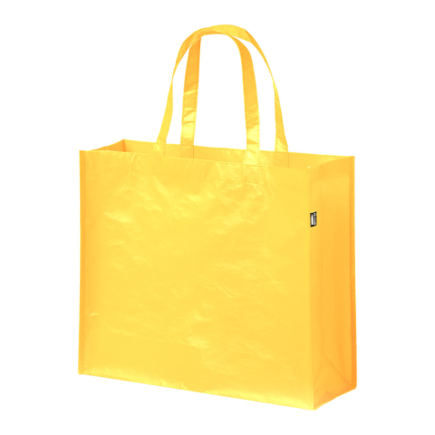 Laminált RPET bevásárlótáska közepes hordfüllel és betoldással, RPET poliészter 105 g/m². Megkülönböztető RPET címkével.