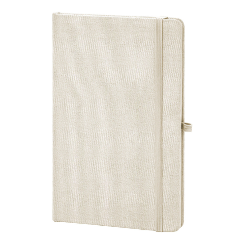 Újrahasznosított pamut borítású jegyzetfüzet 80 vonalas lappal, újrahasznosított papírból. Megegyező színű könyvjelzővel, gumiszalaggal és tolltartóval. A5 méretű.
