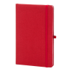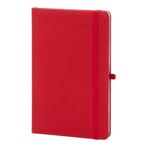 Újrahasznosított pamut borítású jegyzetfüzet 80 vonalas lappal, újrahasznosított papírból. Megegyező színű könyvjelzővel, gumiszalaggal és tolltartóval. A5 méretű.