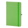 Újrahasznosított pamut borítású jegyzetfüzet 80 vonalas lappal, újrahasznosított papírból. Megegyező színű könyvjelzővel, gumiszalaggal és tolltartóval. A5 méretű.