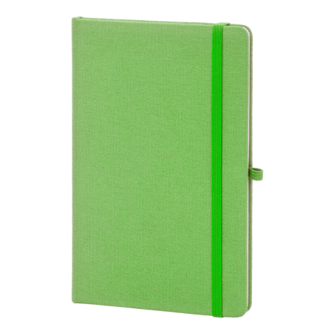 Újrahasznosított pamut borítású jegyzetfüzet 80 vonalas lappal, újrahasznosított papírból. Megegyező színű könyvjelzővel, gumiszalaggal és tolltartóval. A5 méretű.