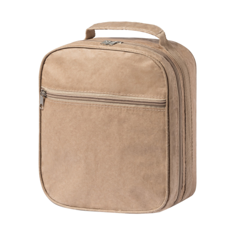 Cipzáras, laminált újrahasznosított papír hűtőtáska alumínium béléssel és elülső zsebbel.