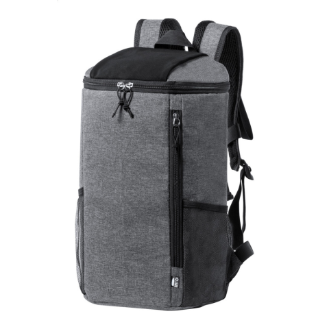 RPET hűtőtáska hátizsák párnázott vállpánttal, hálós oldalzsebekkel, cipzáros rekesszel és PEVA párnázással. 600D RPET poliészter, megkülönböztető RPET címkével.