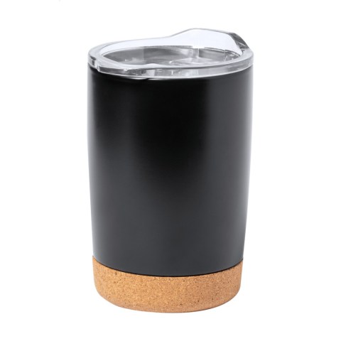 Rozsdamentes acélból készült duplafalú thermo pohár átlátszó fedéllel és parafa talppal, 380 ml. Díszdobozban szállítjuk.