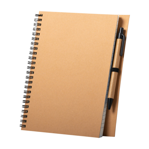 Újrahasznosított karton borítású spirálfüzet 80 db vonalas A5 méretű lapokkal. Tartalmaz egy újrahasznosított papírból készült golyóstollat kék tollbetéttel.