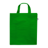 Laminált RPET poliészter anyagú bevásárlótáska betoldással és rövid hordfüllel, 110 g/m². Megkülönböztető RPET címkével.