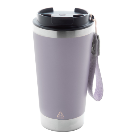 Duplafalú, újrahasznosított rozsdamentes acél thermo pohár PP műanyag fedéllel és hozzáillő színű hordszíjjal. 430 ml.