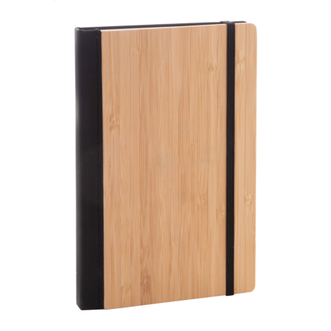 Bambusz és PU bőr borítású jegyzetfüzet 80 vonalas, újrahasznosított lappal, könyvjelzővel és gumipánttal. A5 méret.