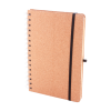 Természetes parafa borítású spirál jegyzetfüzet, búzaszalma műanyag telefon- és tablettartó betéttel. 70 újrahasznosított kraft papírból készült vonalas lappal, gumis pánttal és tolltartóval. A5 méretű.