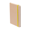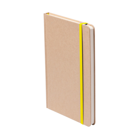 Újrahasznosított karton borítású jegyzetfüzet 100 sima lappal, megegyező színű könyvjelzővel és gumipánttal.