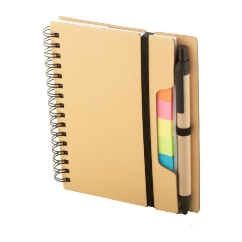 Újrahasznosított papírból készült spirálfüzet 70 vonalas lappal és 125 oldaljelölővel (5 különböző színben). Gumipánttal és tolltartóval. A6 méretű. Újrahasznosított papírból készült golyóstollal és kék tollbetéttel szállítjuk.