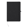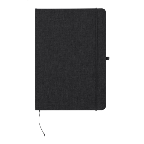300D RPET poliészter borítású jegyzetfüzet 80 sima lappal. Hozzáillő színű gumipánttal, könyvjelzővel és tolltartóval. A5 méretű.