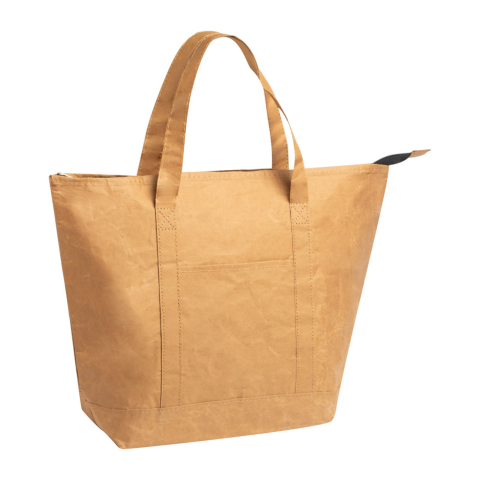 Cipzáras, laminált újrahasznosított papír hűtőtáska alumínium béléssel és rövid hordfüllel.