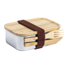 Rozsdamentes acél uzsonnás doboz, természetes bambusz tetővel. Evőeszköz szettel (villa és kanál) és gumipánttal.