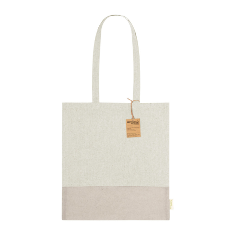 Kéttónusú, újrahasznosított pamut bevásárlótáska, hosszú hordfüllel, betoldással és megkülönböztető újrahasznosított pamut címkével. 100% újrahasznosított pamut, 120 g/m².