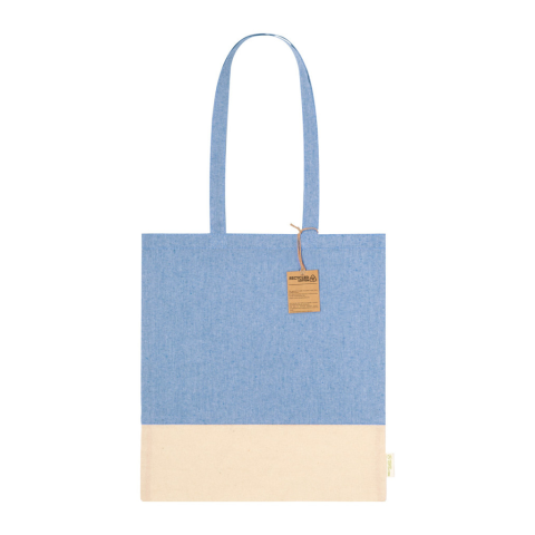 Kéttónusú, újrahasznosított pamut bevásárlótáska, hosszú hordfüllel, betoldással és megkülönböztető újrahasznosított pamut címkével. 100% újrahasznosított pamut, 120 g/m².