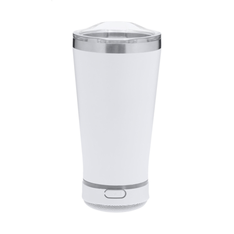 Duplafalú, rozsdamentes acél szigetelt thermo pohár ivófedéllel és vezeték nélküli hangszóróval, többszínű LED lámpával, kihangosító funkcióval és beépített újratölthető akkumulátorral. 440 ml.