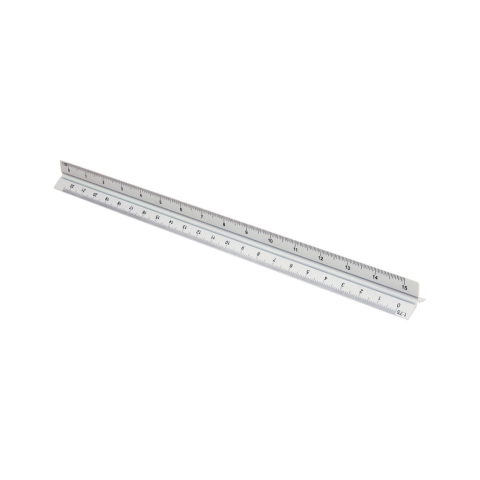 Háromszögletű, alumínium méretarány vonalzó. 30 cm-es vonalzóval és 1:20/1:25/1:50/1:75/1:100 méretarányú skálákkal.